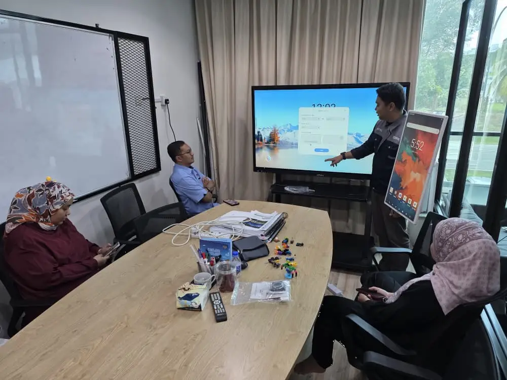 Israk Solutions supplied and installed the ARV600-65″ AI Smartboard at HMH Planning Consultant in Johor, featuring Android 14 (8GB RAM, 256GB storage) with integrated Windows OPS (Intel i5, 256GB SSD), complemented by the FlipTouch ARVTSP-32″ secondary interactive screen and ARV5800 mobile stand (Year-End Sales promotion) — supporting 3D renders, master plan reviews, zoning accuracy, and immersive client presentations.