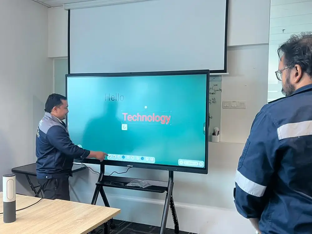 Israk Solutions supplied and installed the ARV600-75 AI Smartboard at TechnoMech (M) Sdn Bhd, featuring a 75-inch responsive touch display, real-time annotation, multi-touch collaborative input, seamless multimedia presentation, and video conferencing integration — complete with professional installation, system configuration, and user guidance.
