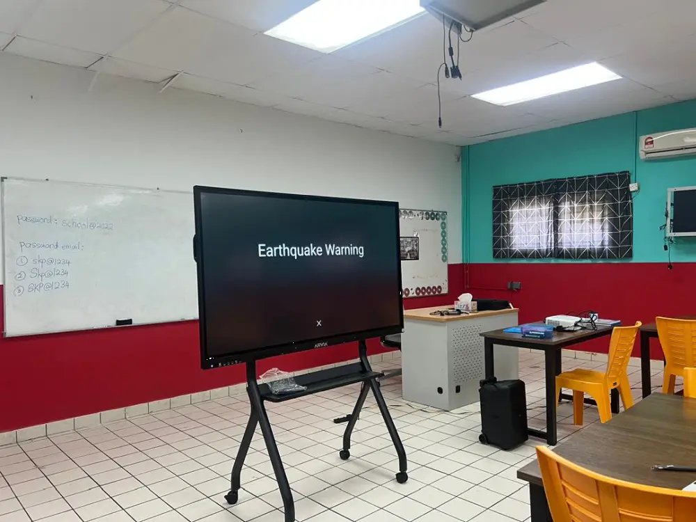 2x ARV200-65 4K UHD with Arvia DMS Israk Solutions supplied and installed two units of the ARV200-65 interactive smartboard featuring 4K resolution and responsive multi-touch capability on premium S57 adjustable stands at SK Puchong, Selangor, integrated with Arvia DMS (Device Management System) for centralised device monitoring, usage analytics, and content management — spearheaded by the school’s technology coordinator, Cikgu Yanti.